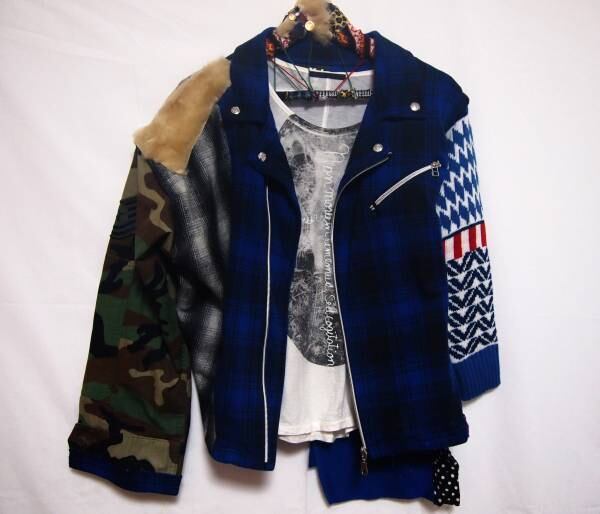 ●チェックのライダースジャケットをメインに迷彩・ファーなどの異素材を大胆にパッチワークしたデザインの解体ライダースジャケットです。
