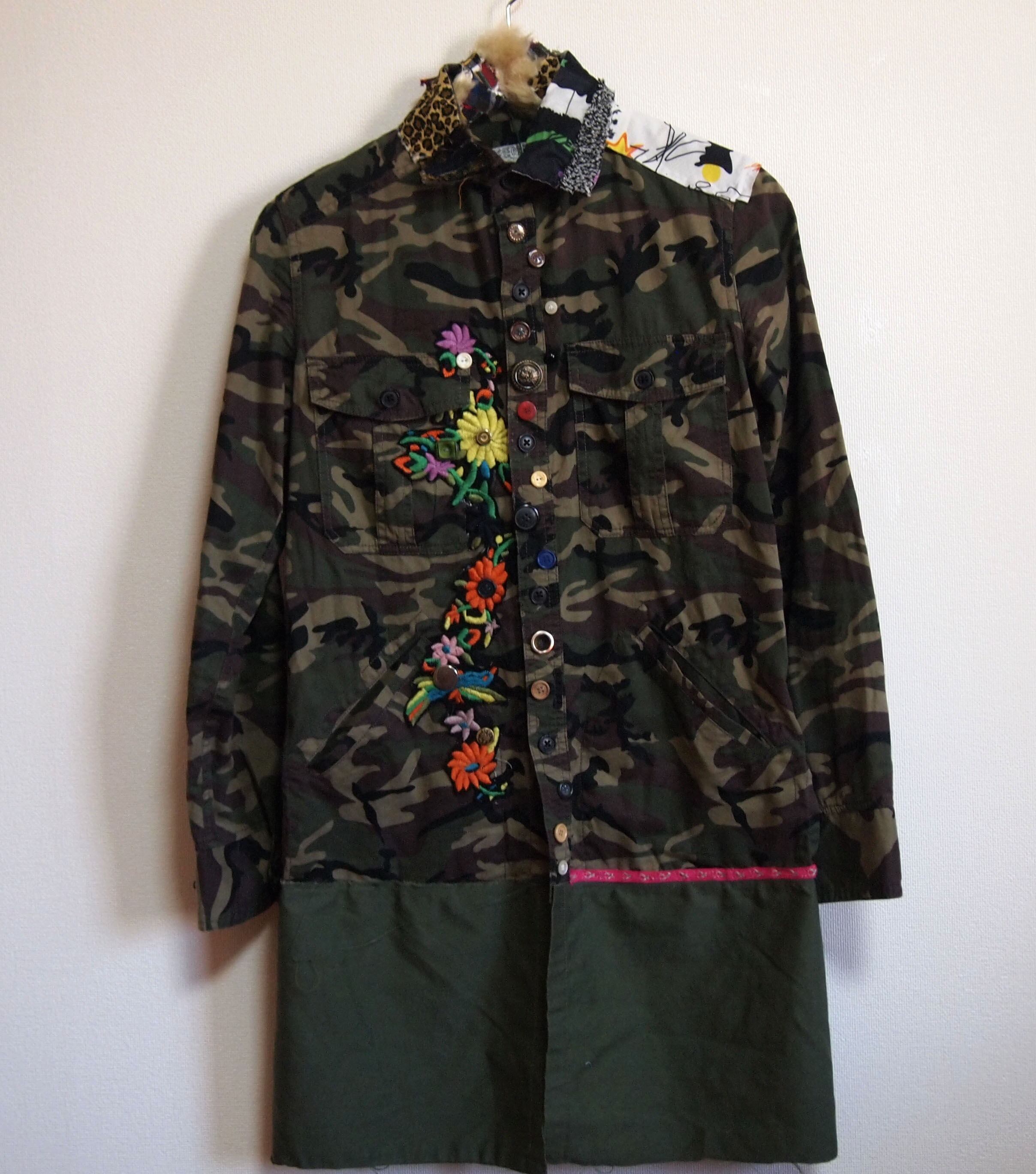 ●迷彩柄の生地をベースに刺繍・エプロンなど様々な生地を大胆にパッチワークしたデザインのシャツです。