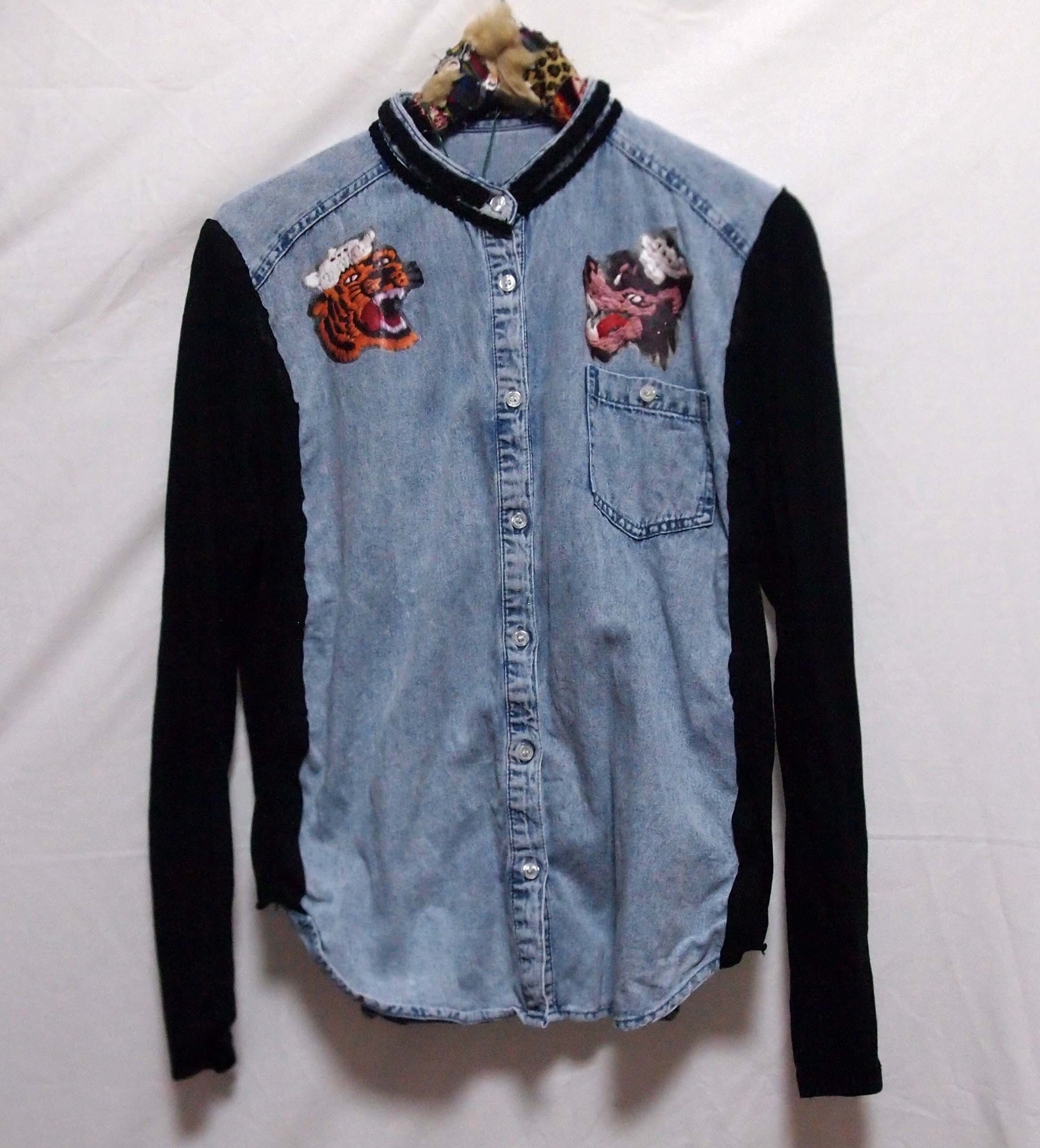 ●薄手のデニム生地をベースに袖部分での切り替え生地や刺繍転写を施したデニムシャツです。