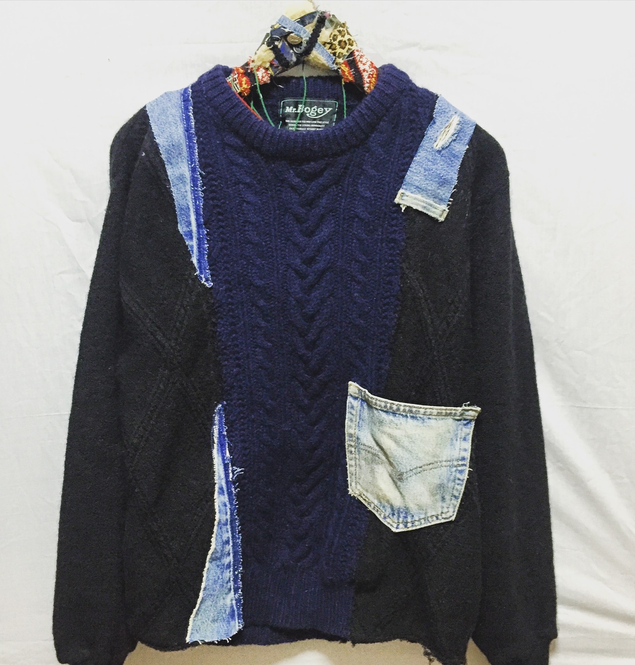 ●2種のニットを切り替えたベースに無造作にデニムパッチワークされたデザインです。